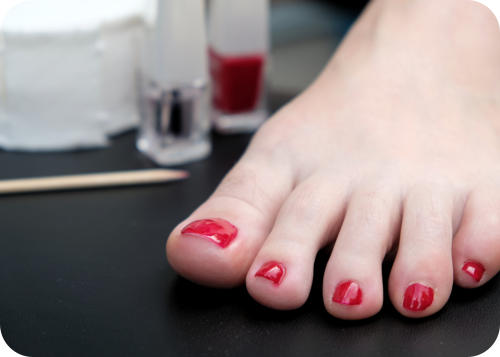 After soaking the feet in a relaxing foot spa, the nails are shaped, cuticles